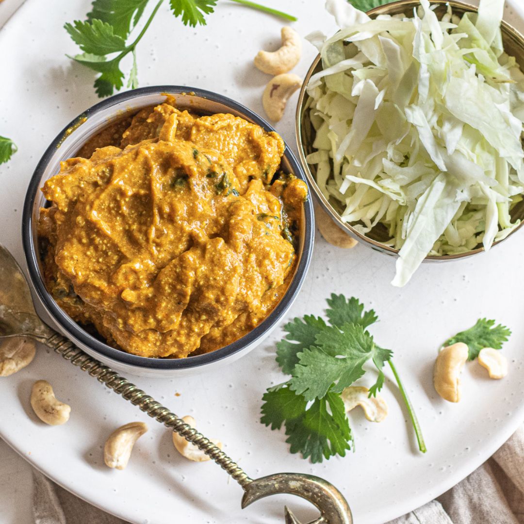 7. Place cabbage noodles into a bowl and cover with boiling water for a couple of minutes and then strain. then add the butter chicken on top. When serving, place a TBsp of natural yoghurt and garnish with coriander.